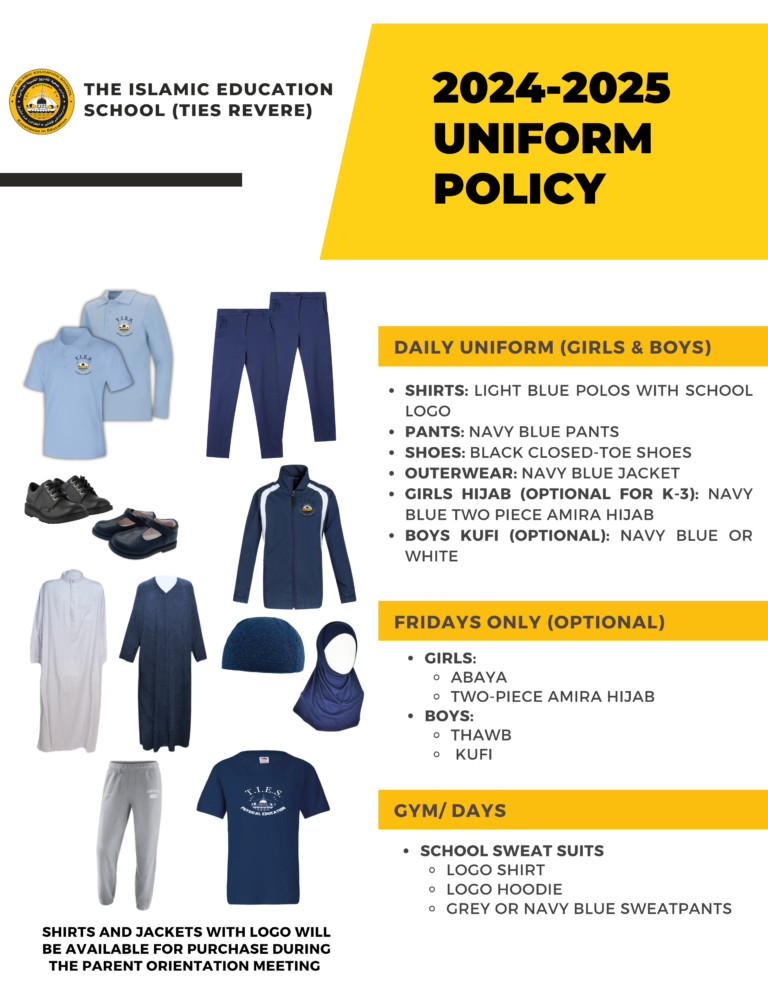 Students attending TIES are required to wear school uniforms. Information on daily uniforms, gym uniforms, special events dress code, school logo, and where to purchase uniforms is available below.